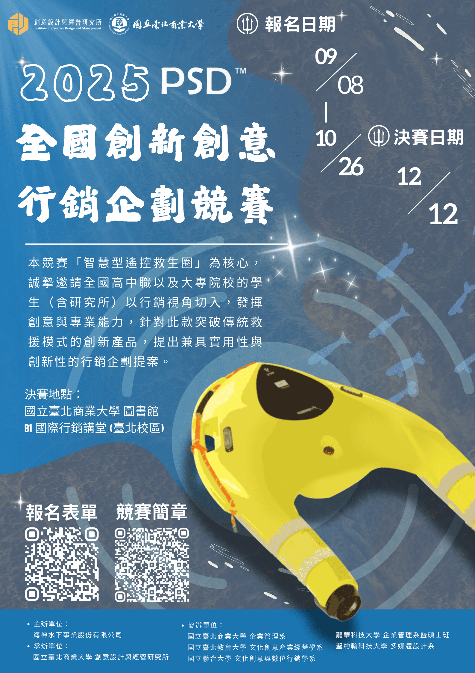 國立臺北商業大學創意設計與經營研究所承辦海神水下事業股份有限公司之「2025 PSD全國創新創意行銷企劃競賽」活動辦法更新