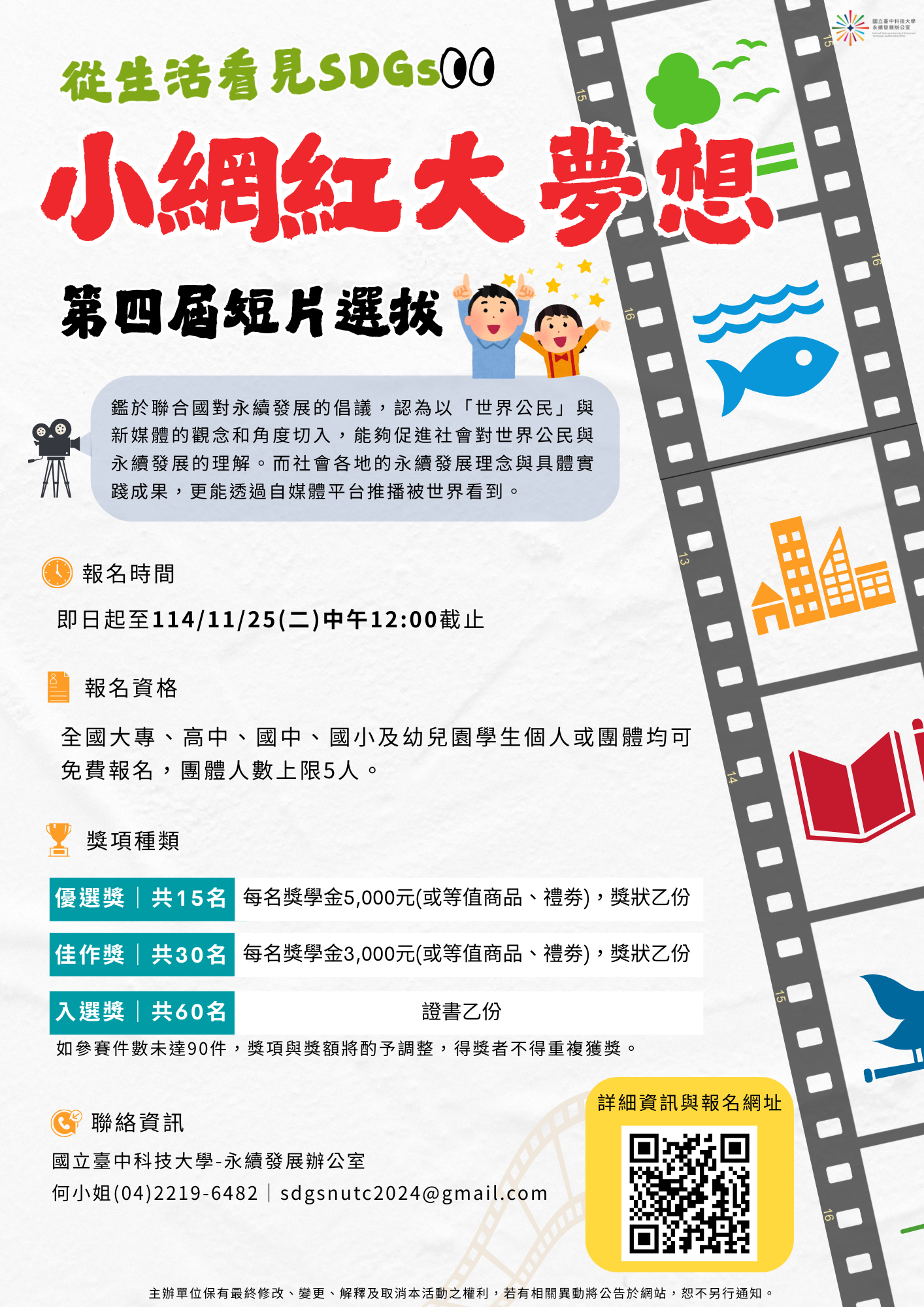 一、本活動旨在推廣聯合國永續發展目標(SDGs),鼓勵幼兒 園至大專院校學生以短片形式展現對「家庭價值」、「綠 色旅遊」及「地方創生」等議題之關注與創意。