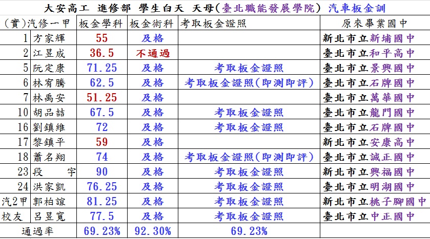 恭喜 段宇 等8人 考取 汽車板金 學術科專案檢定