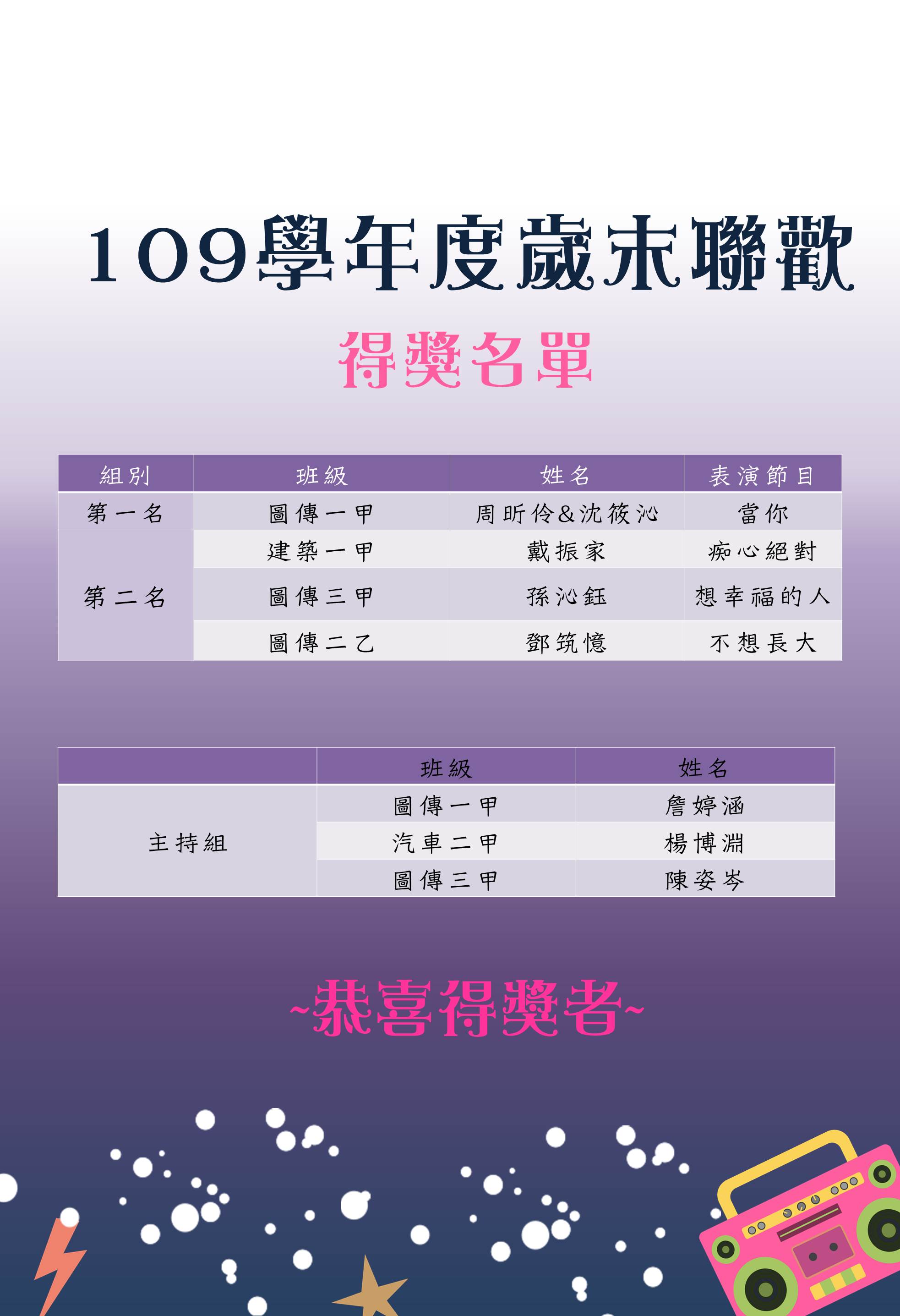 公告109學年度歲末聯歡才藝競賽得獎名單